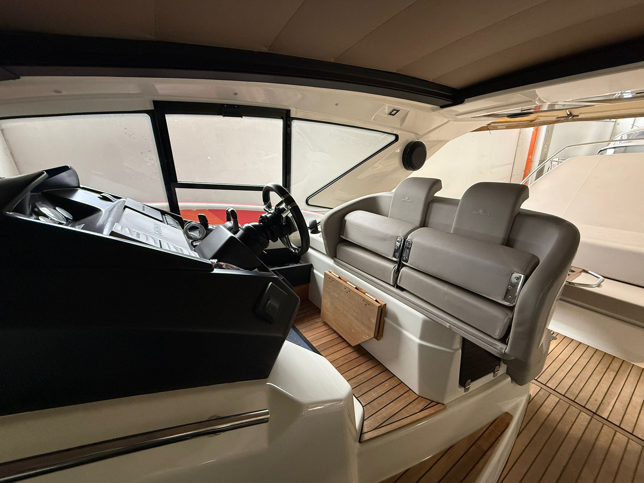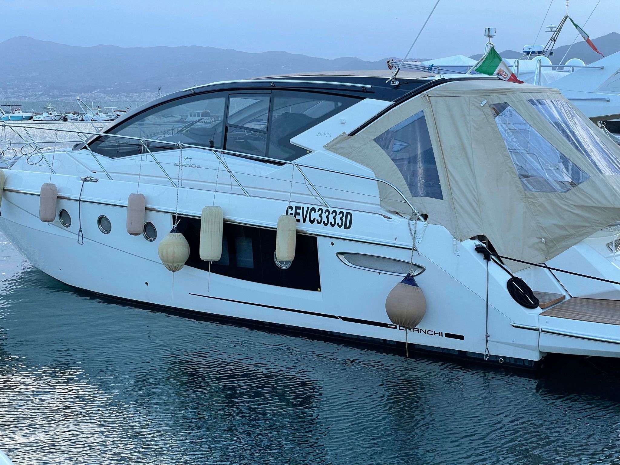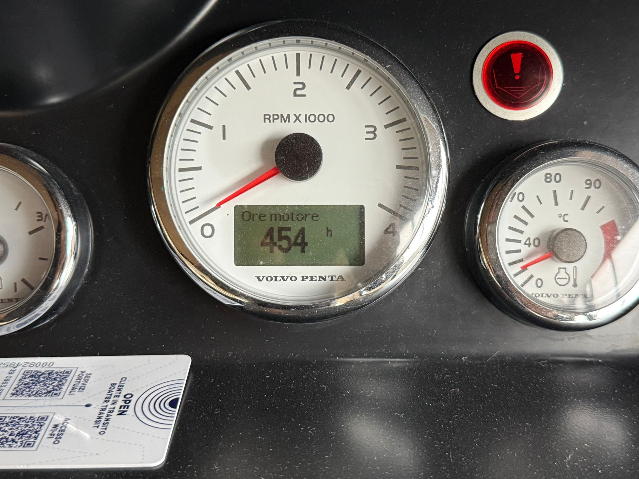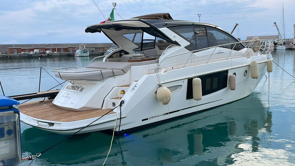 Barca Cranchi M44 con 2 motori Volvo Penta D6 EVC/E/DPI + joystick + trip computer + single lever + cruiser control + power trim assistance, anno 2022 con 457 ore. Gli optional presenti sono: impianto microaspirazione acqua, aria condizionata 16000 BTU con pompa di calore, capottina chiusura completa beige (alterantivo allo standard) , comandi al volante, elica di prua con estintore automatico, frigorifero pozzetto, GPS/chartplotter a colori Garmin 12″, cambio strumentazione da Raymarine a Garmin, grill elettrico mobile pozzetto (modifica mobile e grill come Z35), luci prua, n.3 luci subacquee, orologio barometro termoigrometro, oscurante completo verticale pozzetto+destro+sinistro microforato nero, passerella idraulica 3 stadi a scomparsa, pilota automatico Garmin, radio upgrade casse altoparlanti a prua e subwoofer, teak pozzetto, teak camminamento trincarini laterali, telecomando verricello con contametri integrato, VHF/DSC Garmin, copia certificato CE, tappezzeria esterna in silvertex, verniciatura hard top nero vulcano, verniciatura protettiva lucida per tavolo pozzetto in teak, immatricolazione, bimini top, materassi, moquette, oscuranti 100% sulle finestre in plexiglass della cappottina, moquette sui gradini entrata in cabina, lampade comodino personalizzate, aggiunta presa corrente 220V camera poppa, aggiunta mensola nel bagno, antiribalta, serratura porta cabina di poppa come bagni, presa 220V nel garage, daytona con altezza 15cm sotto chaiselounge.