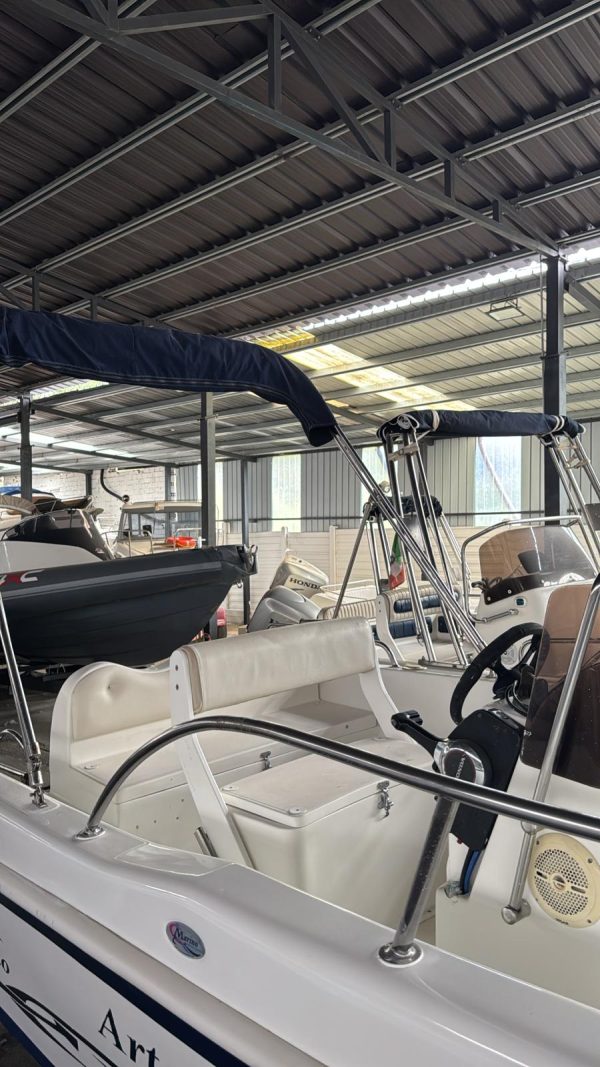 Barca Artemide 500 con motore Honda 40 E CV. Dotata di Cuscineria completa, pompa di sentina, luci di via, tromba,  pannello elettrico di comando, bussola, stacca batteria, strumentazione motore, scaletta, tendalino parasole con struttura inox, dotazione di bordo per 7 persone entro 6 miglia